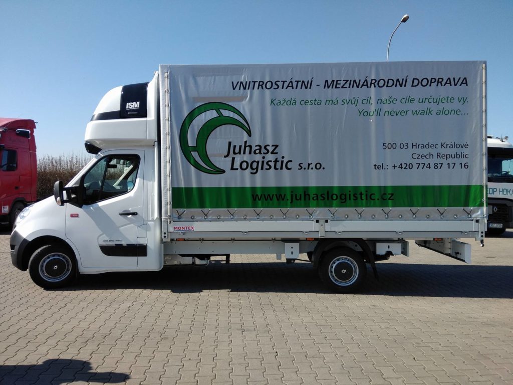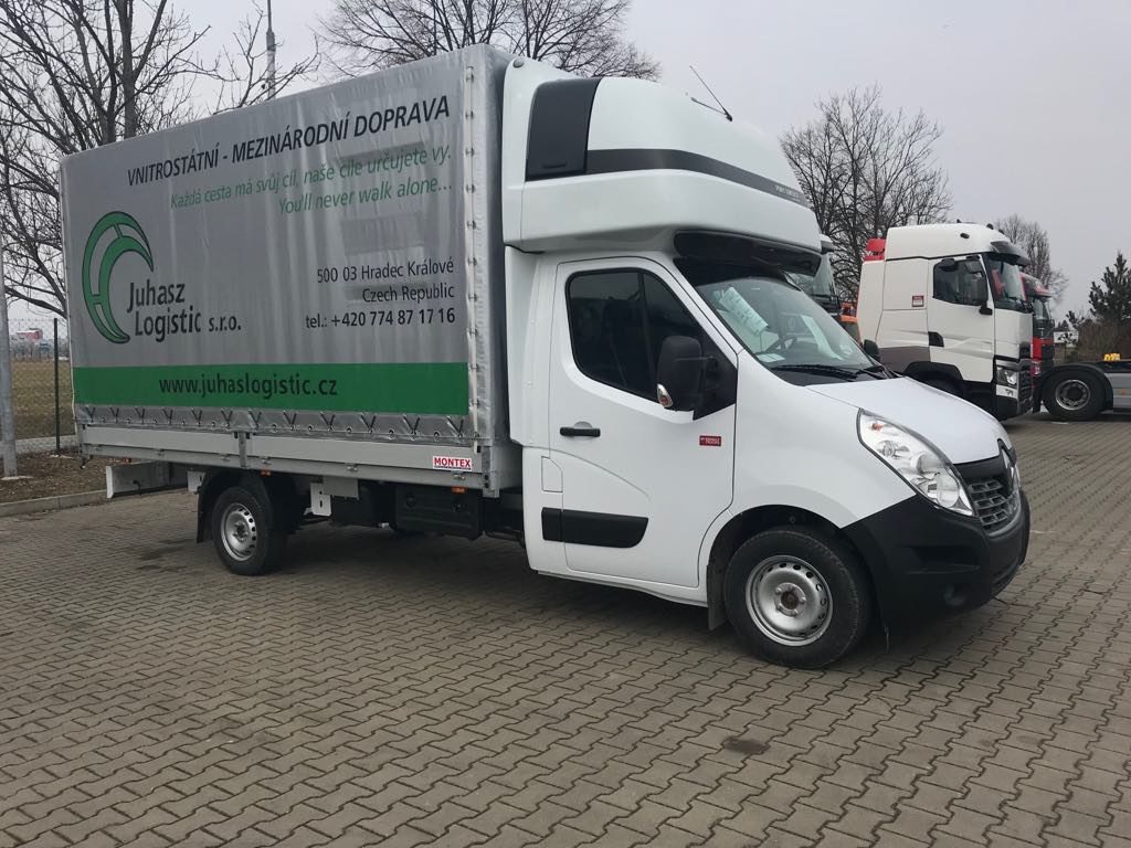 Dodávka Renault Master na 9 europalet o rozměrech 4,53 x 2,2 x 2,28 m (dxšxv) s nosností do 1,5t, možností po Evropě i po vnitrostátních silnicích.